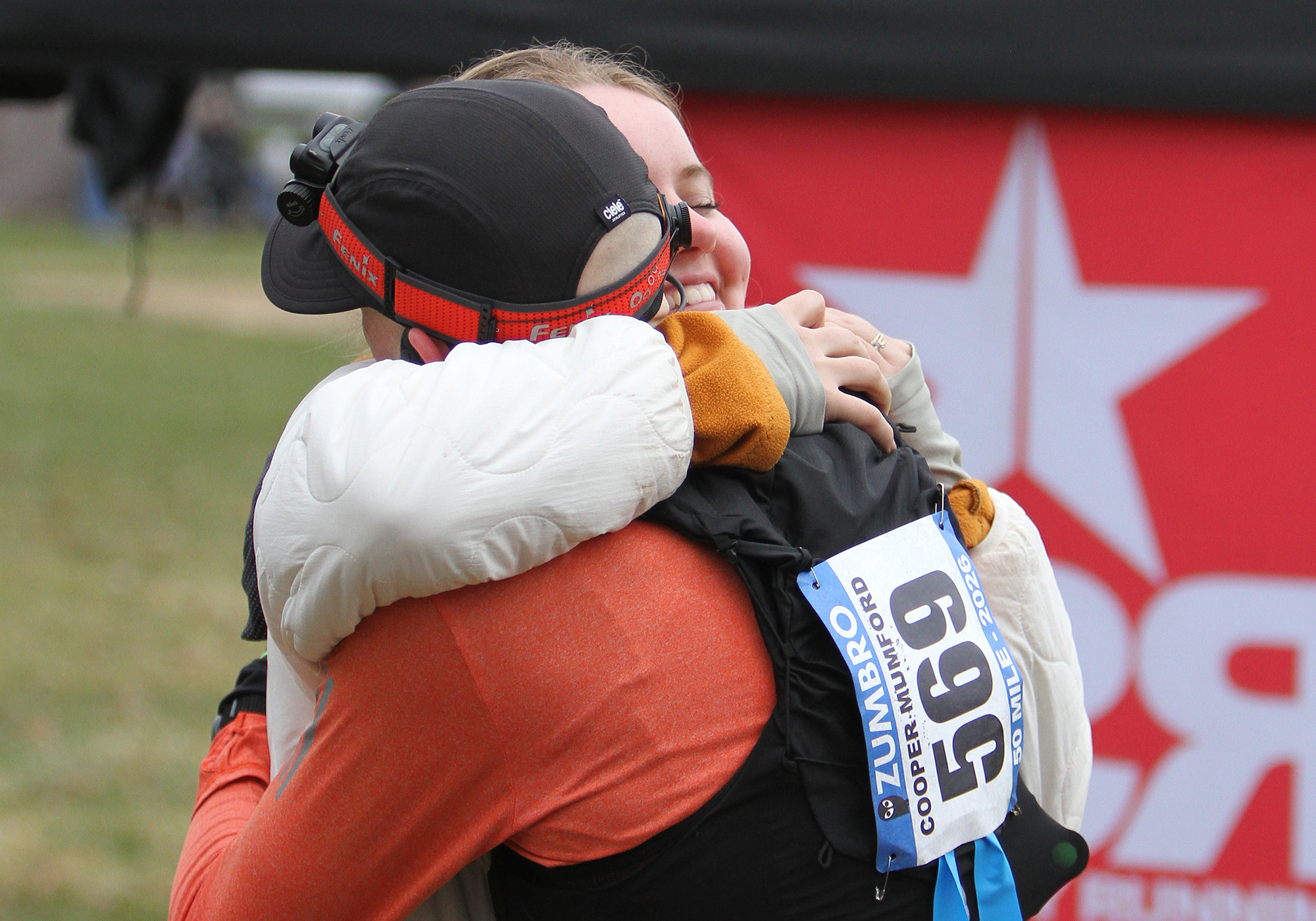 2026 Zumbro 50 mile 2nd place overall Cooper Mumford greeted warmly at the finish – Photo Credit Pat Lehnherr